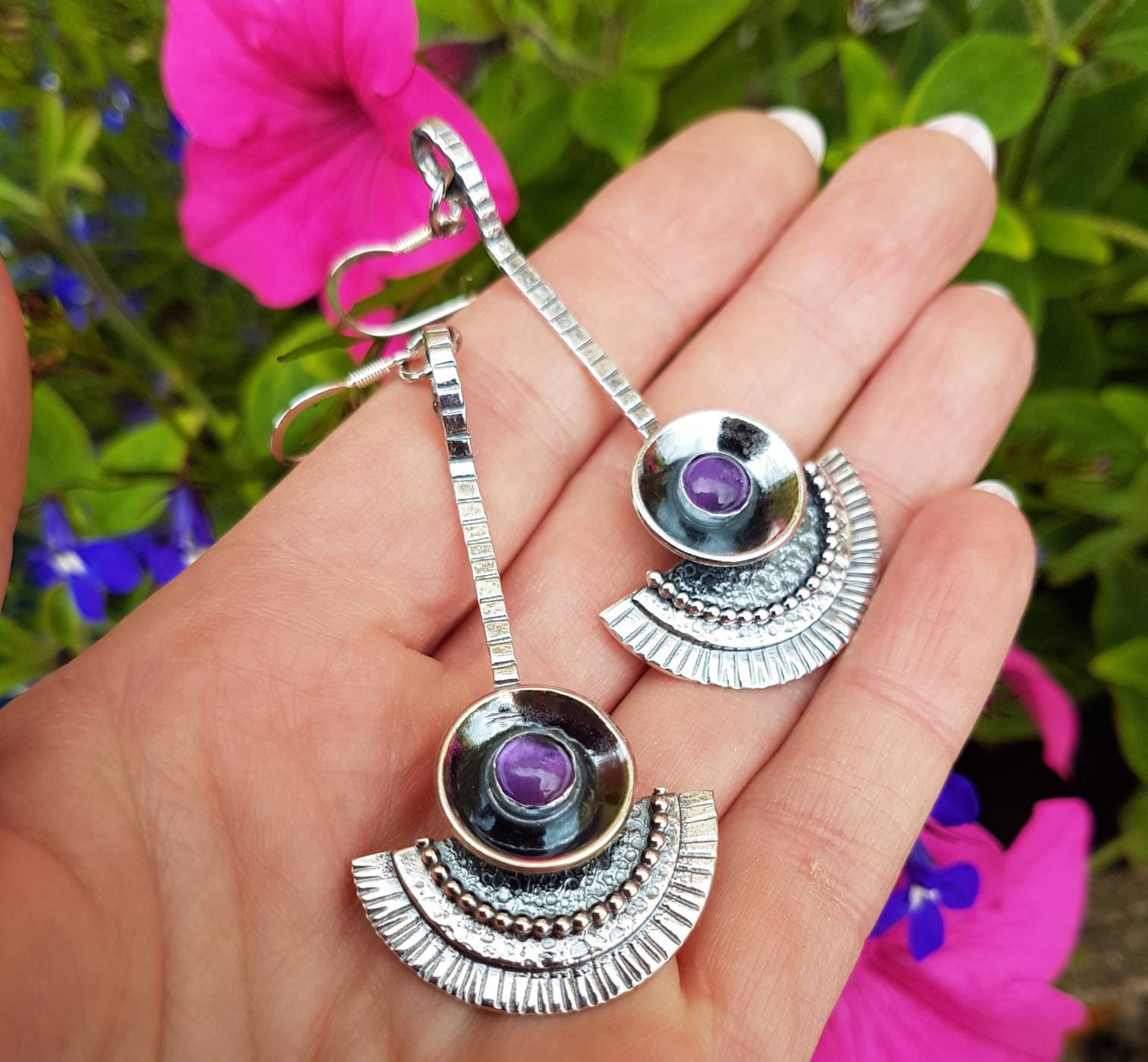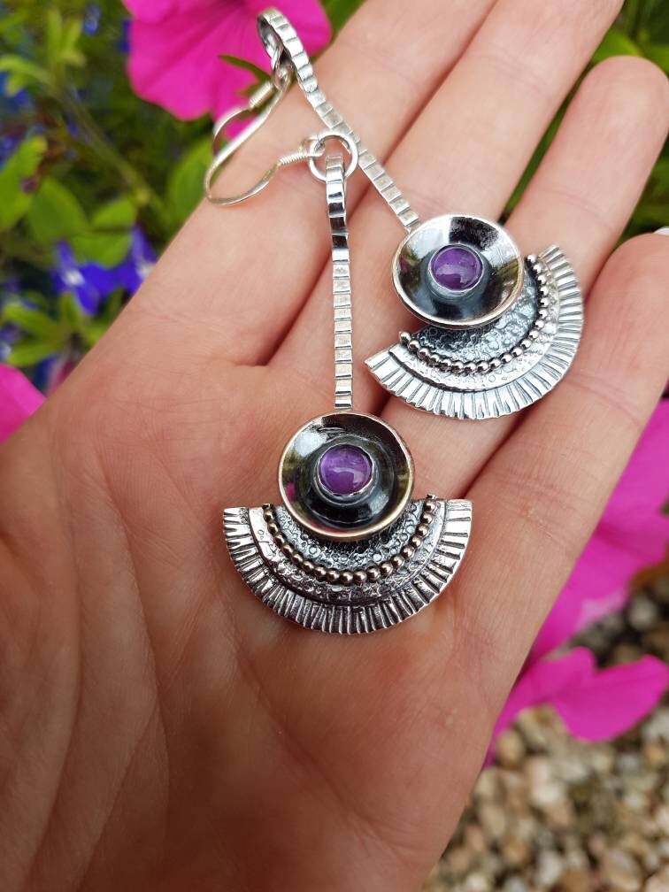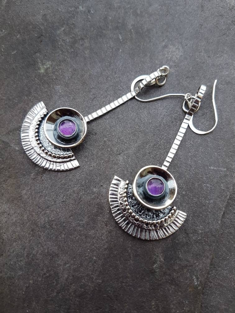 Silver and amethyst dangle tribal beaded earrings , with loads of texture and movement , and a glowing purple amethyst in the domed centre piece . These earrings are full of different hammered textures and contrast between the dark patina and bright silver , lovely in the light !! a tribal or even egyptian feel to these .. a go to earring
