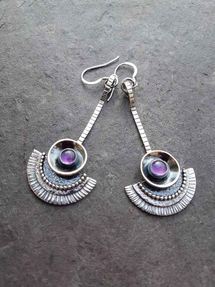 Silver Amethyst Dangle drop tribal style earrings with texture and patina