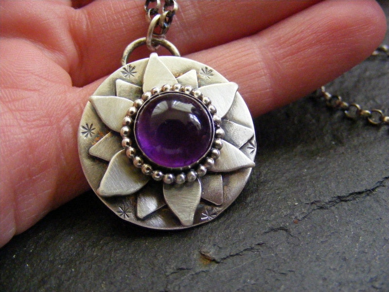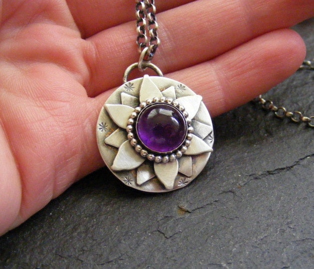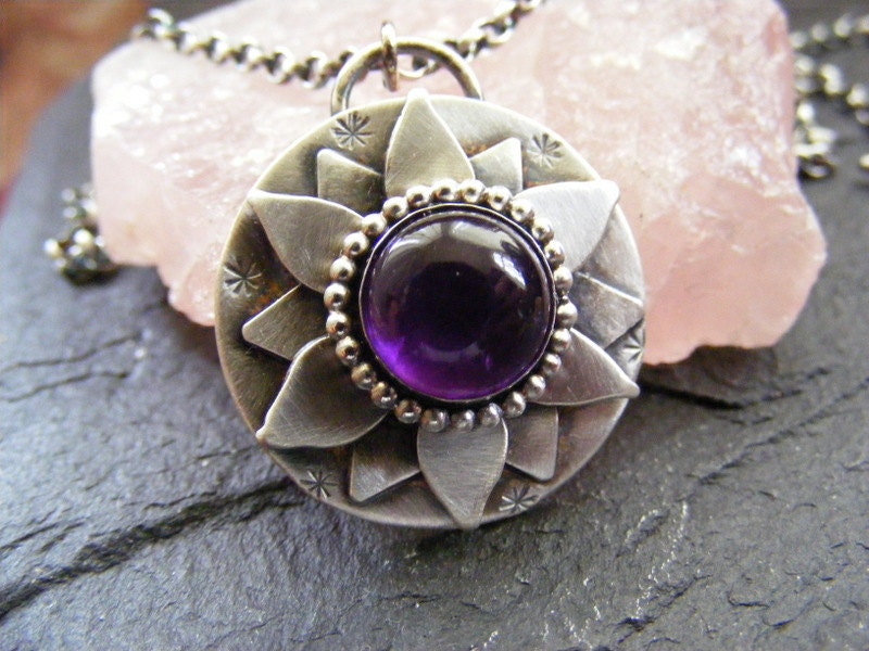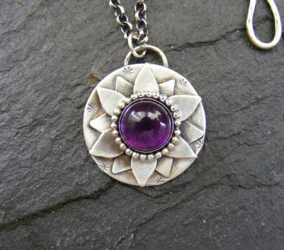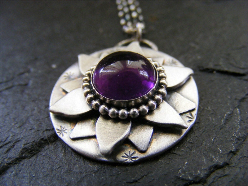 A sterling silver lotus flower pendant with amethyst and handmade clasp with rolo/belcher chain.