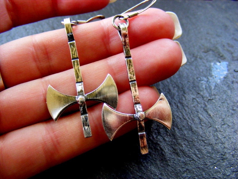 Silver axe earrings with hammered detail and little silver 'nails' , These mini hatchet style earrings are fun and quirky for showing your inner warrior They are lightweight and wearable ,perfect for a fun loving person ...unique,edgy and feminine all at the same time