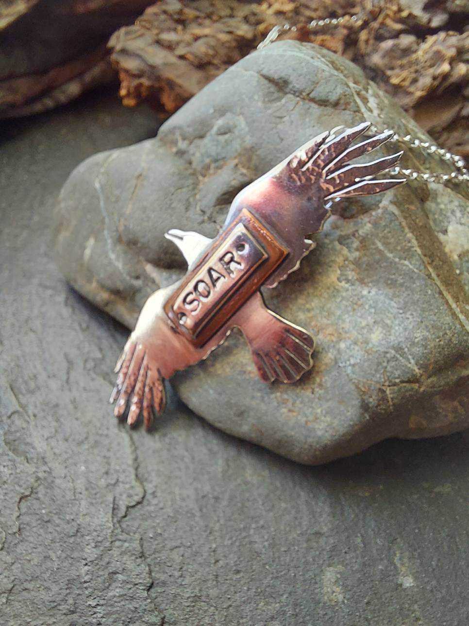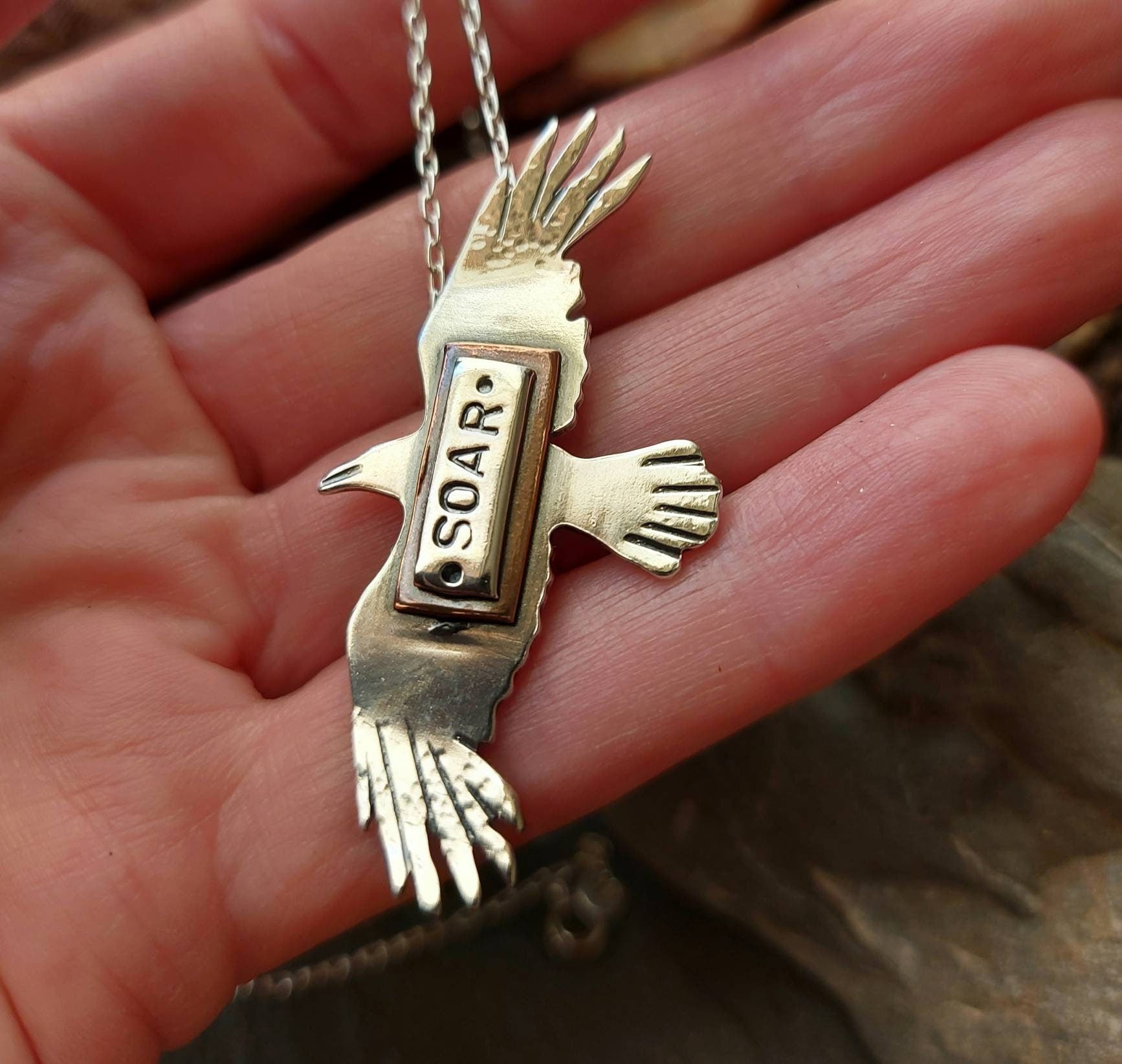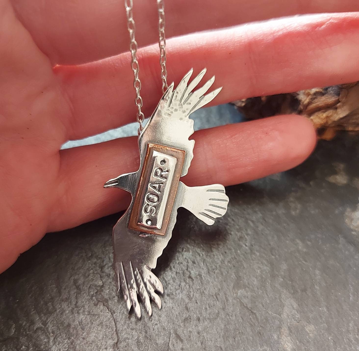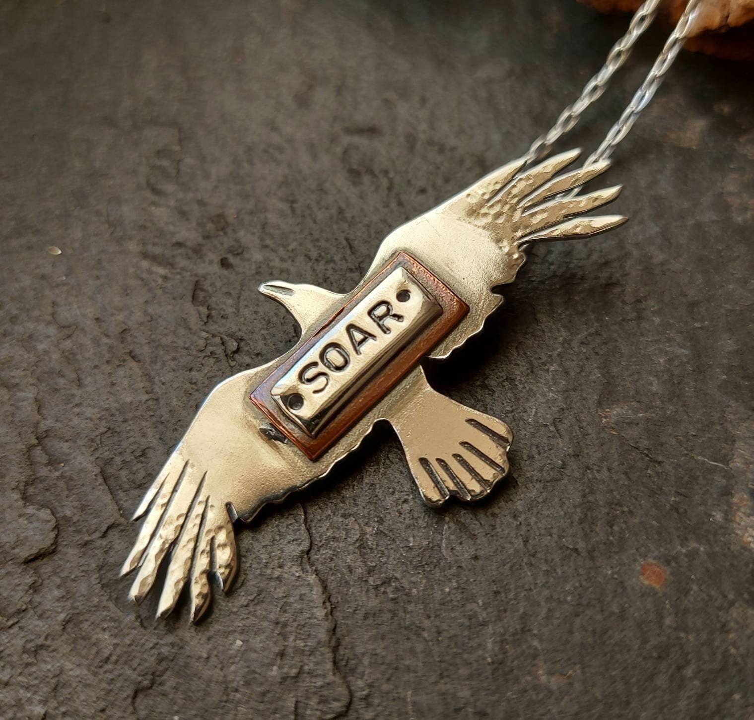 The raven has been completely handcrafted from sterling silver with soar stamped on a little plaque , with three layers for depth and movement . The wings are slightly dipped and curled in as if in flight