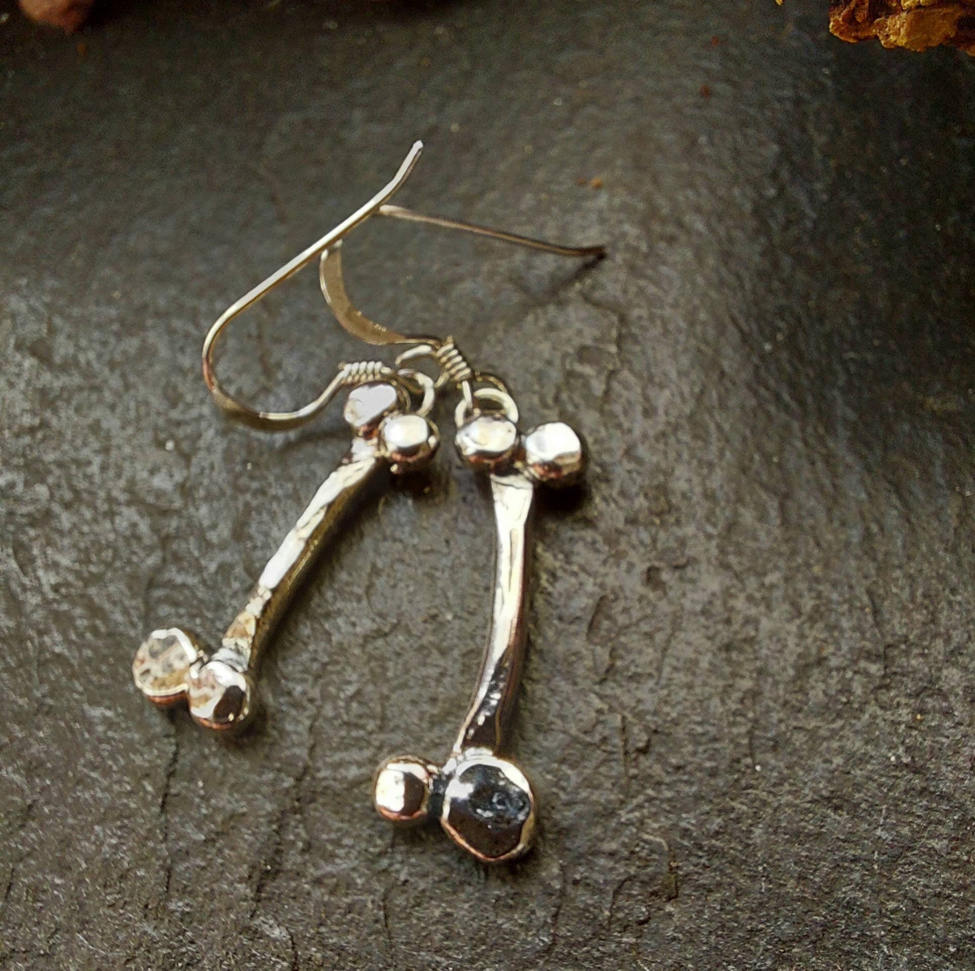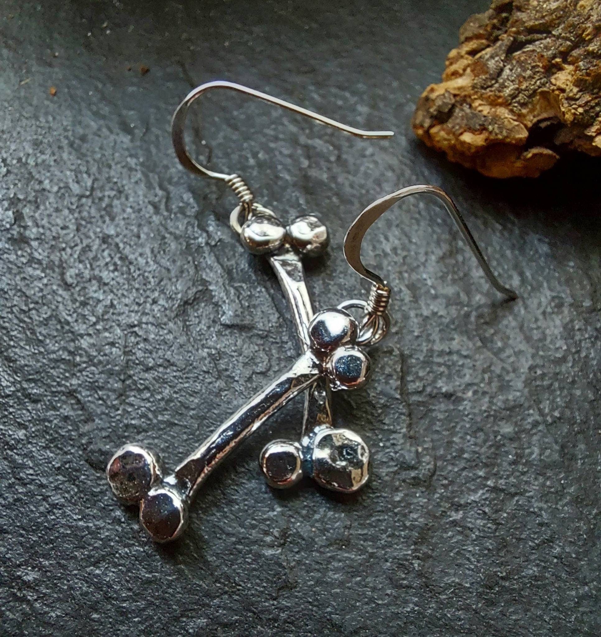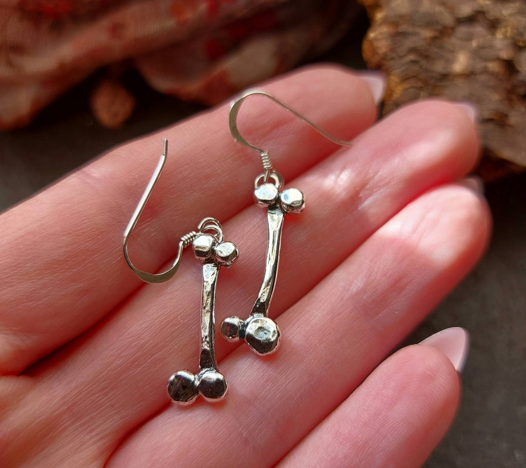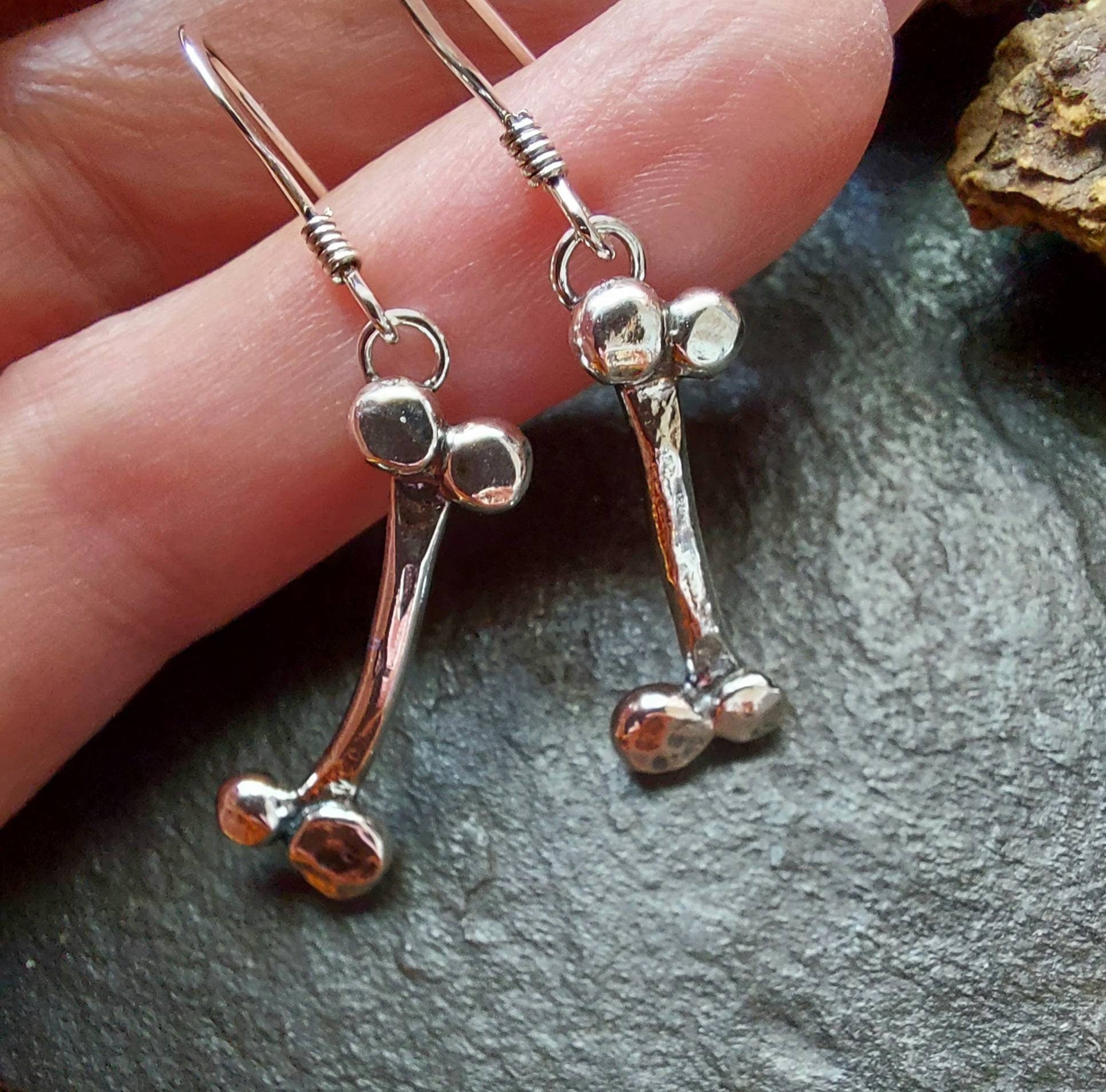 Silver long bone style earrings in sterling silver with little lines and oxidization along their length.