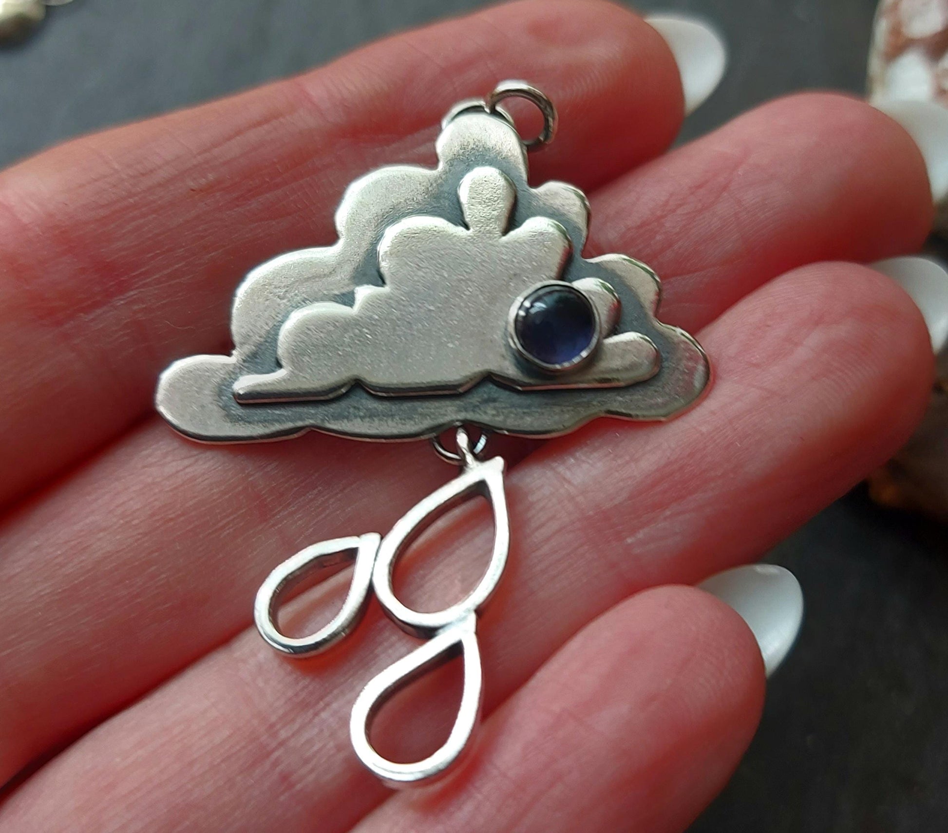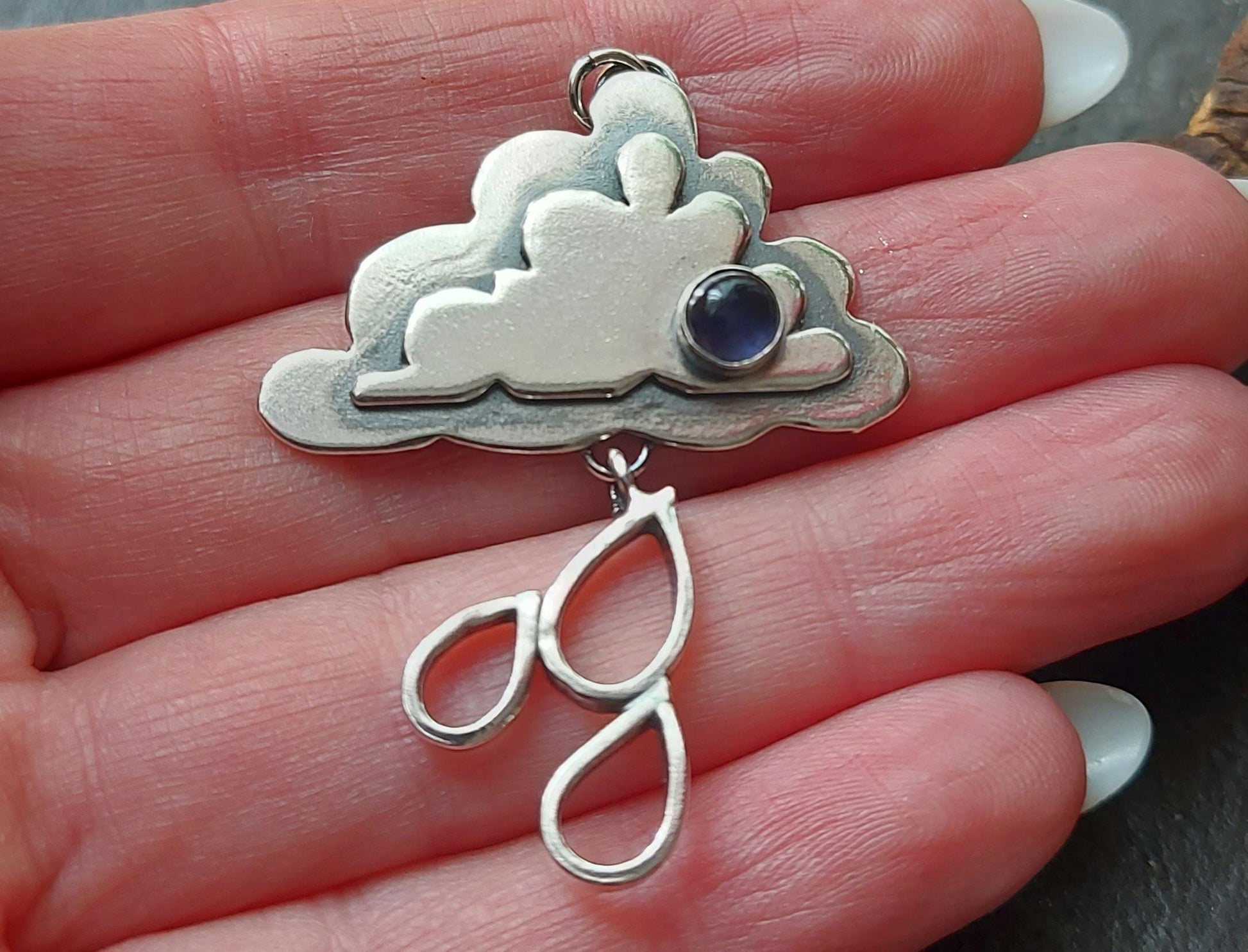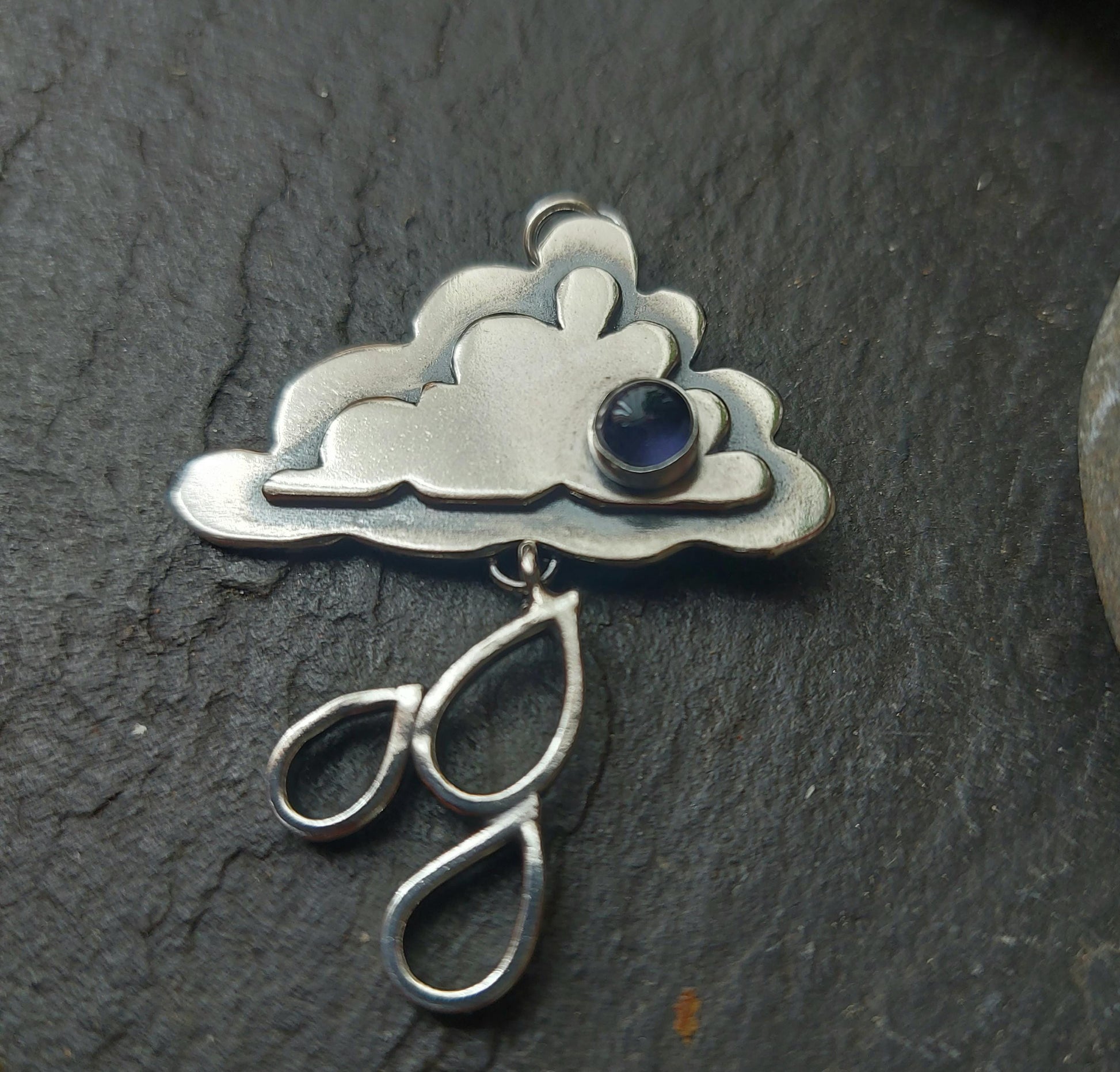 A lovely sterling silver layered cloud with angled raindrops , swinging below , and a glowing iolite gemstone . The pendant has been handsawn and soldered by me with a little oxidization for contrast . Highly polished and eye catching , the little drops catch the light at every turn
