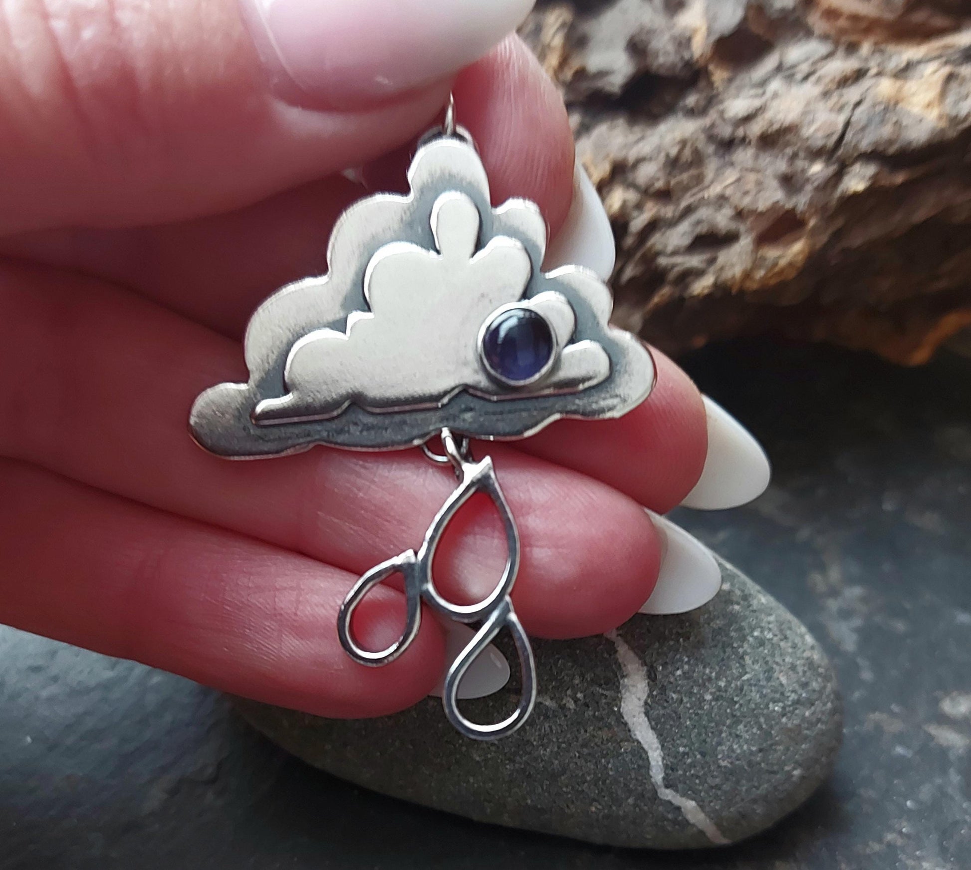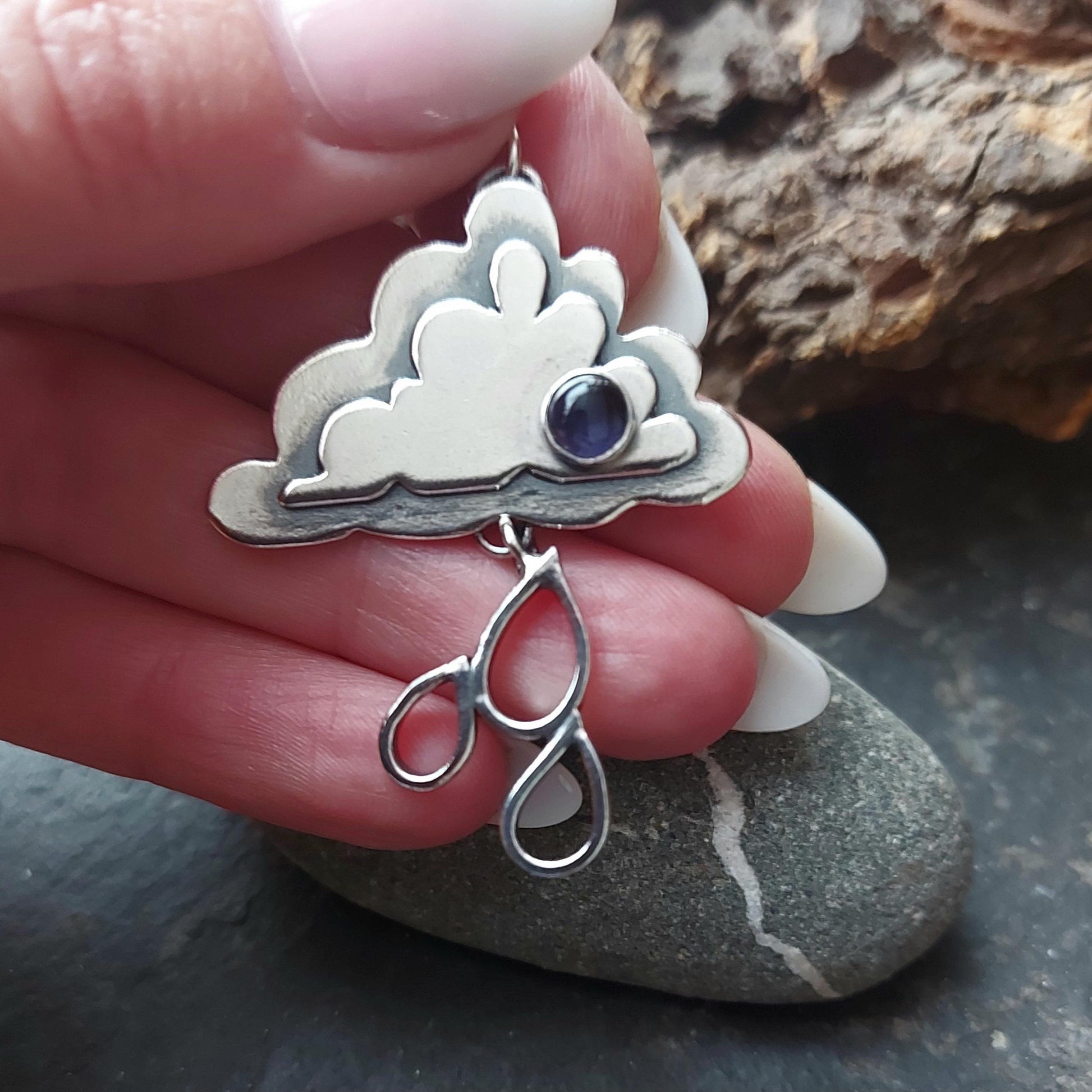 Silver cloud and raindrops necklace with iolite.,Sterling silver cloud with gemstone pendant