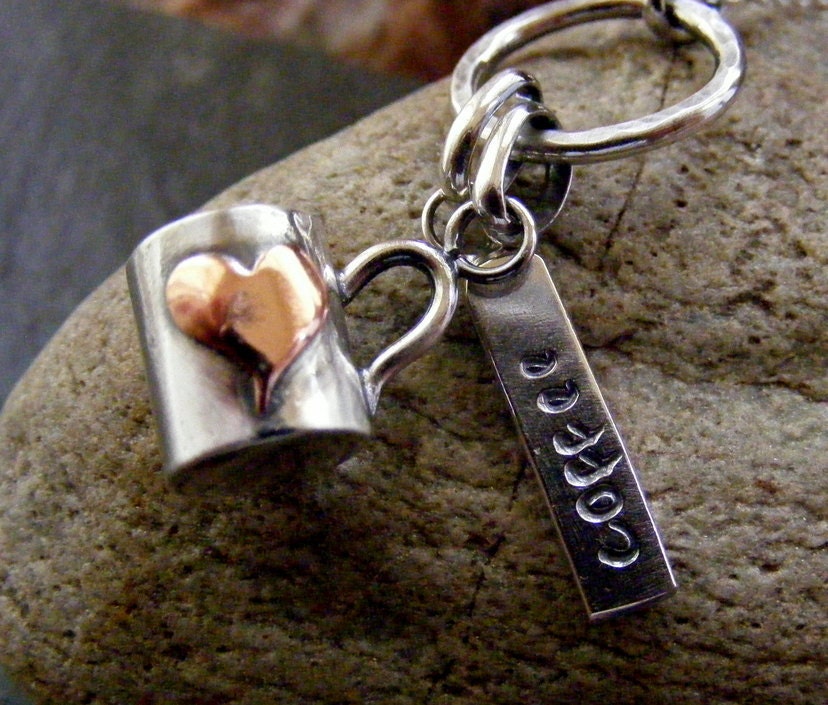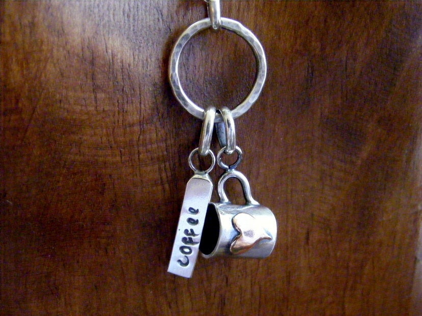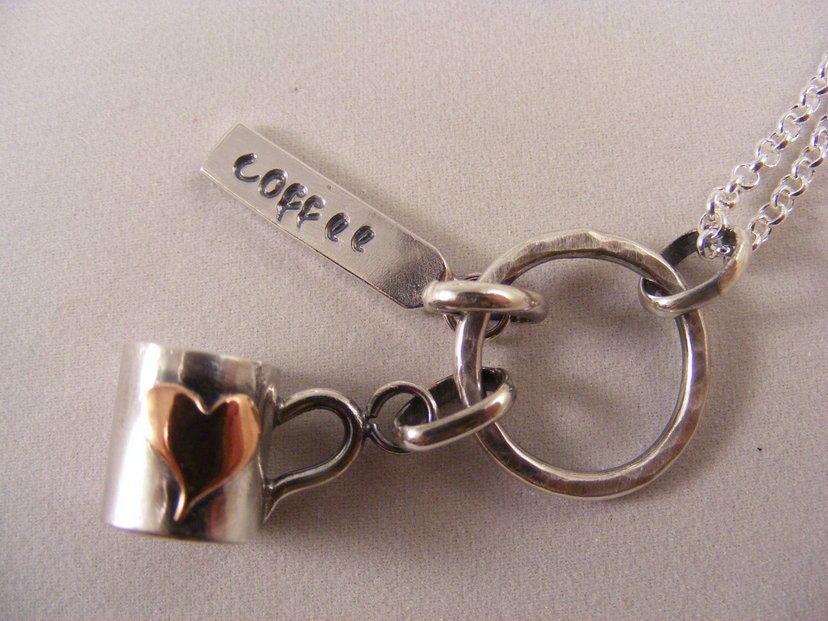 A silver coffee mug cup necklace with a difference !! Totally handmade charms , a little mug with a copper heart ( usable if required lol) and a silver heavy tag with coffee stamped on it