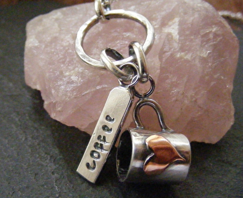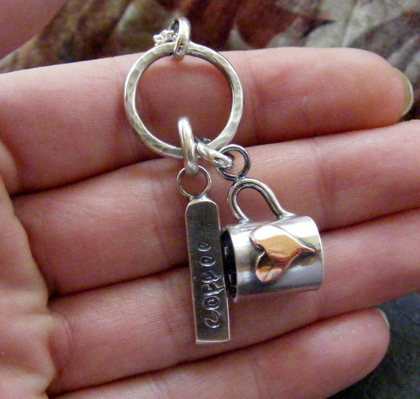 Silver coffee cup handmade charm and silver tag ,mixed metal, coffee lovers necklace