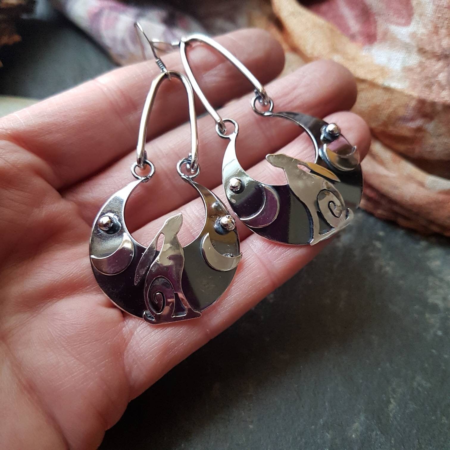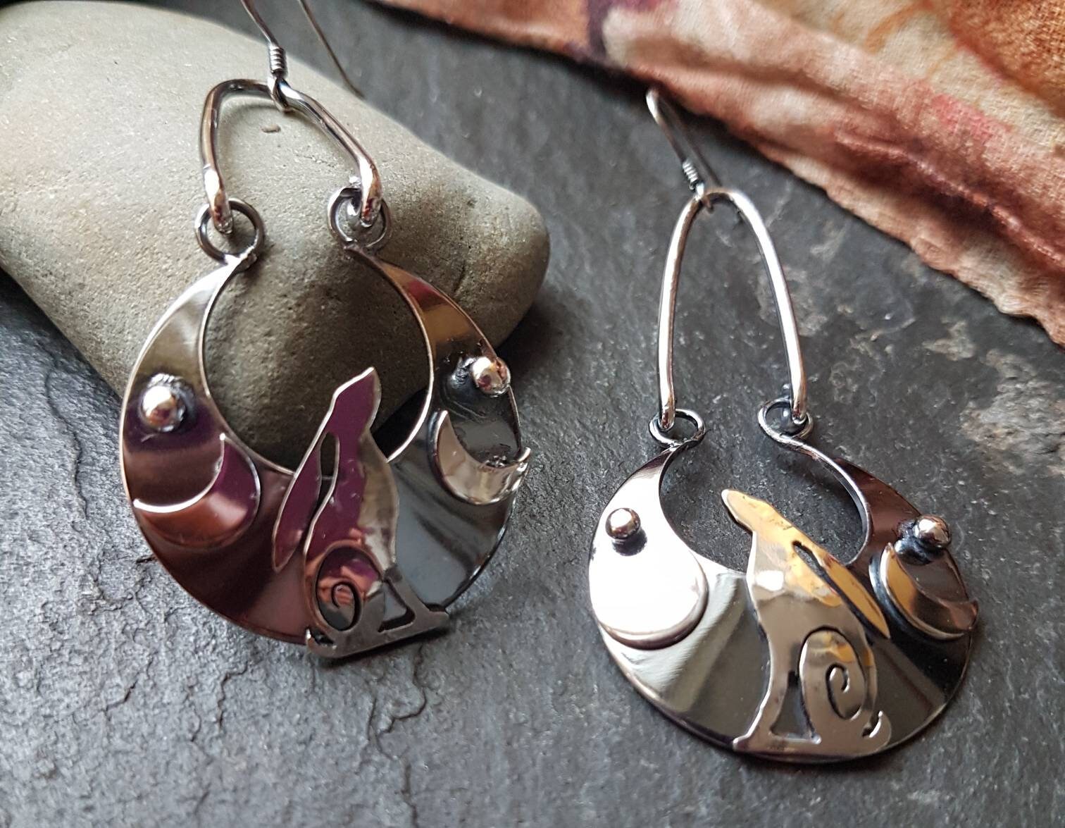 The layered effect gives a lovely impression of depth and the moon is oxidised for more contrast against the silver hare and moons , the earrings are paired so that they are opposites of each other , either facing away or at each other