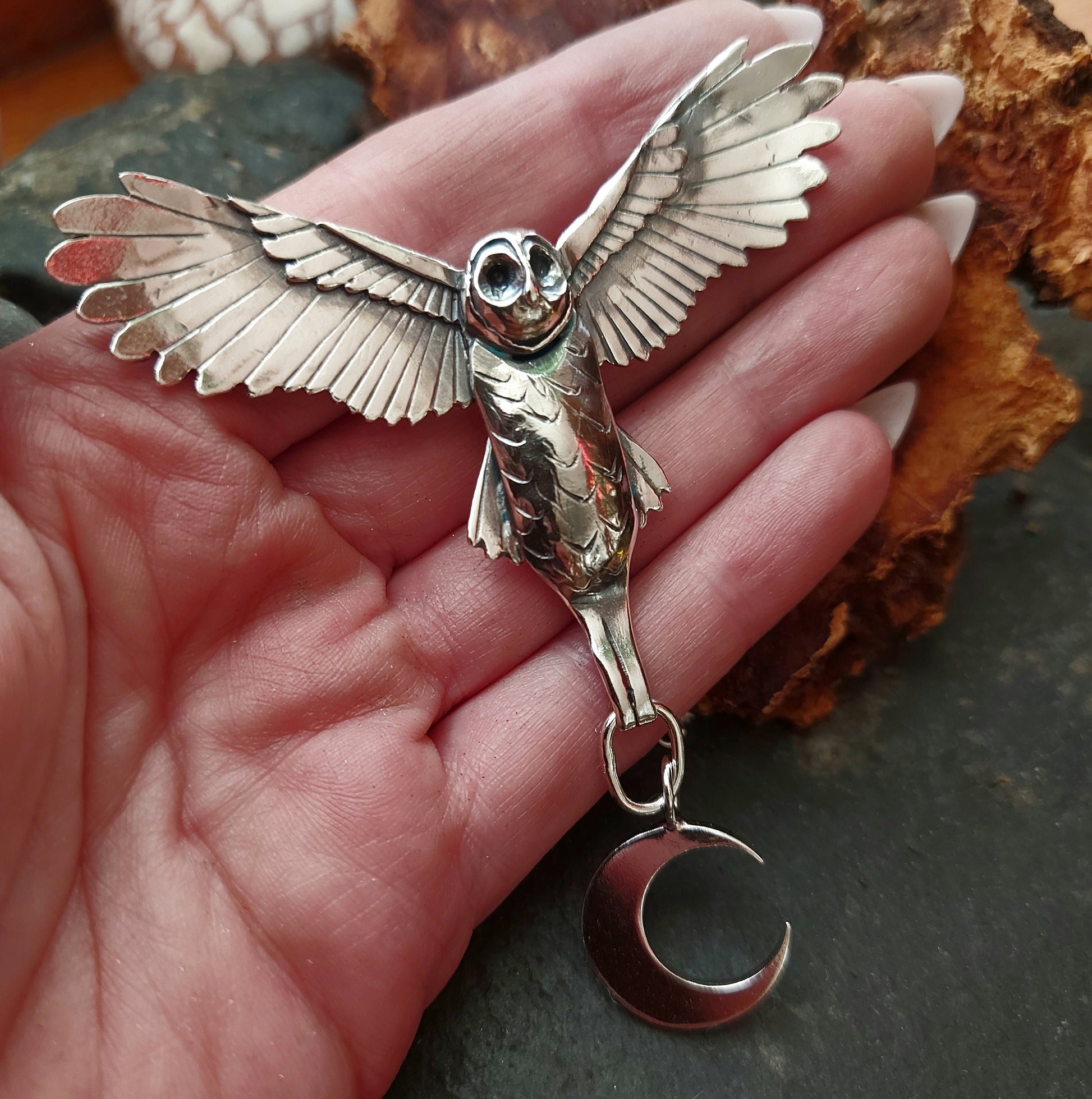 A silver owl necklace with a petfect crescent moon drop, totally handmade and formed from sterling silver , with a lifelike face and outspread wings . The owl has been hand sawn , and layers added to form its body and wings , the necklace is attached to a heavy belcher/rolo chain with a lobster catch , which has been oxidized and brushed for a more rustic feel.