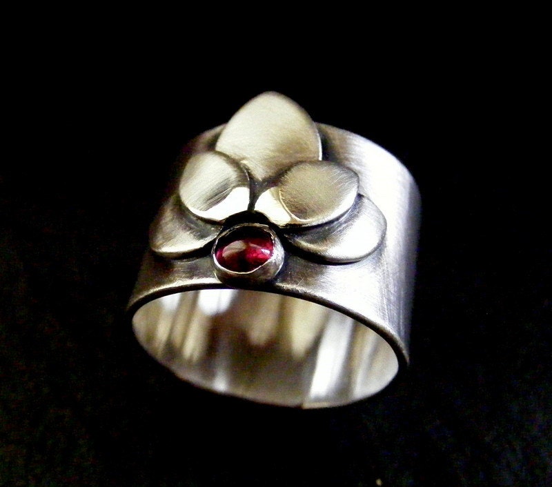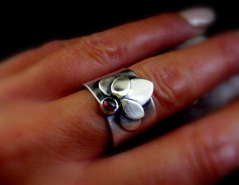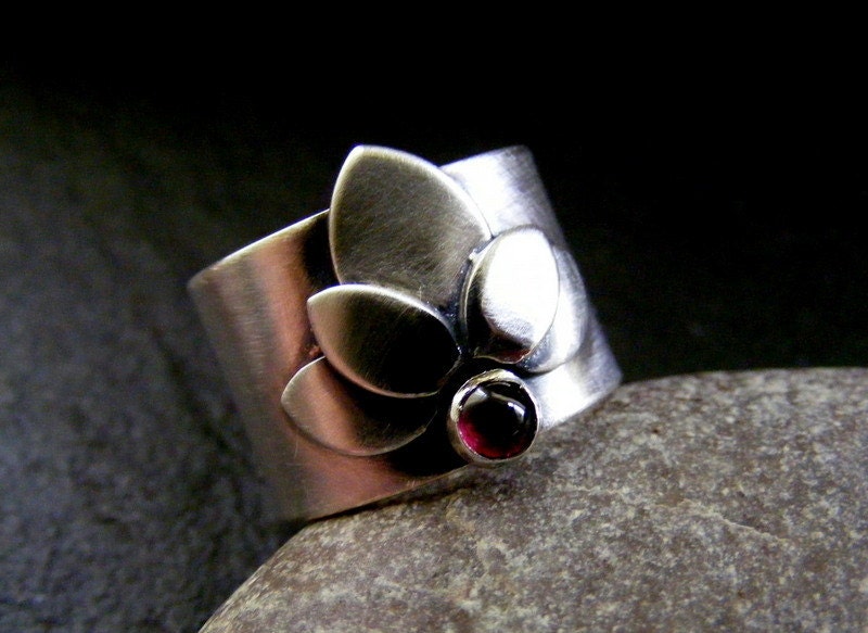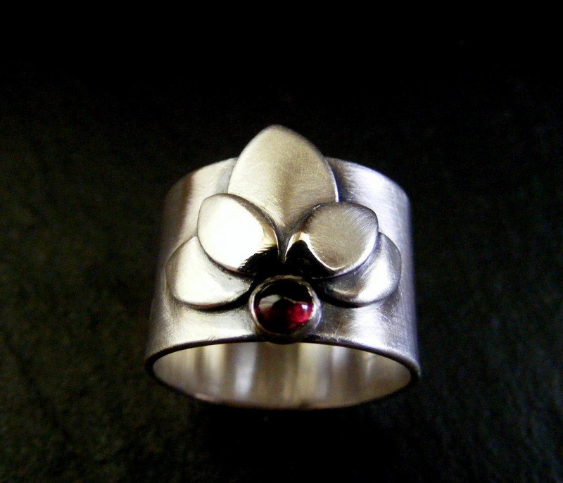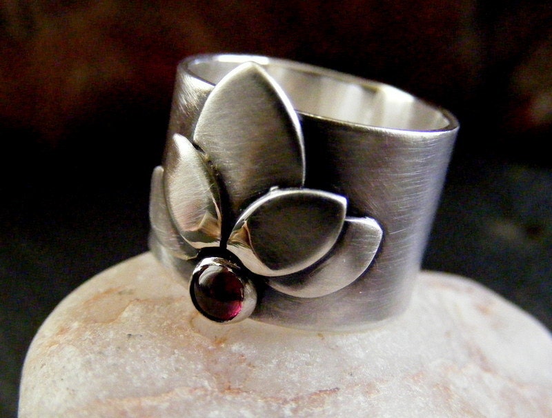 A silver lotus flower ring and glowing garnet gemstone, This ring has been hand sawn and soldered by me and set with a lovely 4mm garnet for a splash of colour. The ring has a 13mm band and a satin finish with highly polished highlights. The ring is totally handmade and is unique and individual.