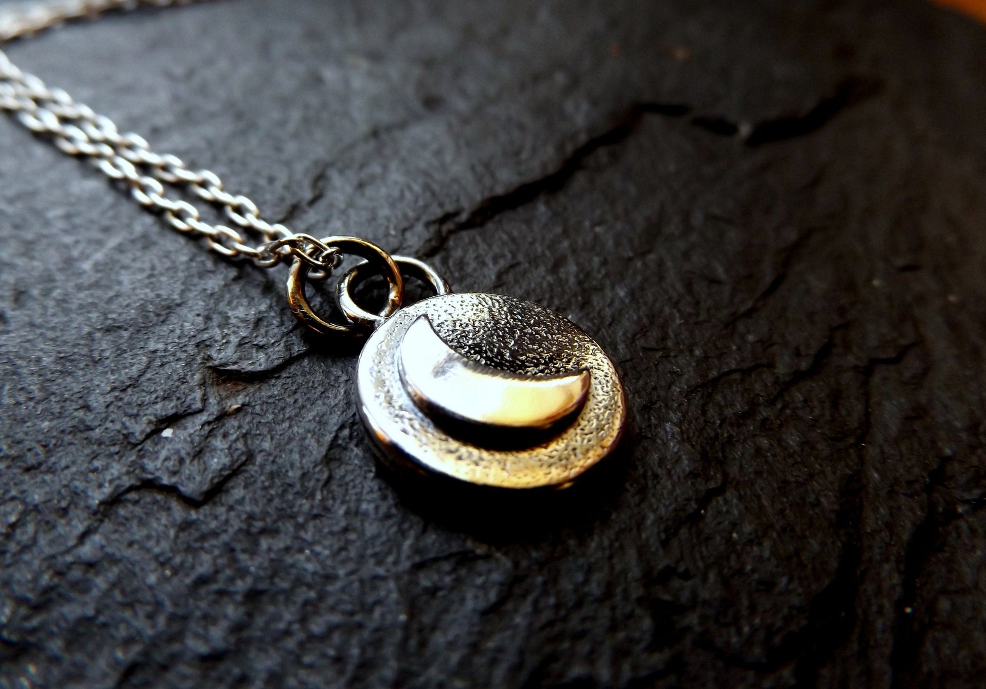 This is a solid sterling silver crescent moon textured pendant with a satin oxidised finish.The crescent is brushed and the remainder of the little moon is textured and polished , a great everyday pendant