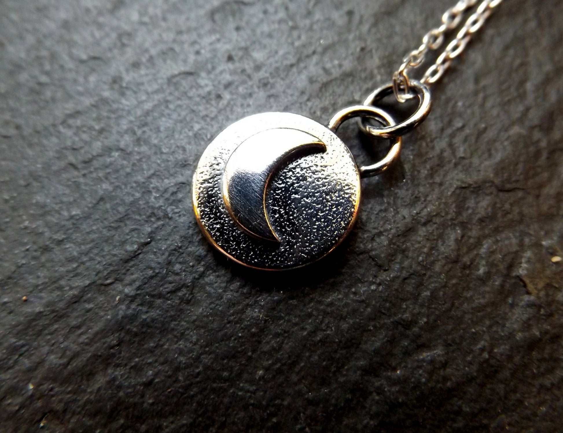 Silver moon necklace with textured background and polished finish , small moon pendant
