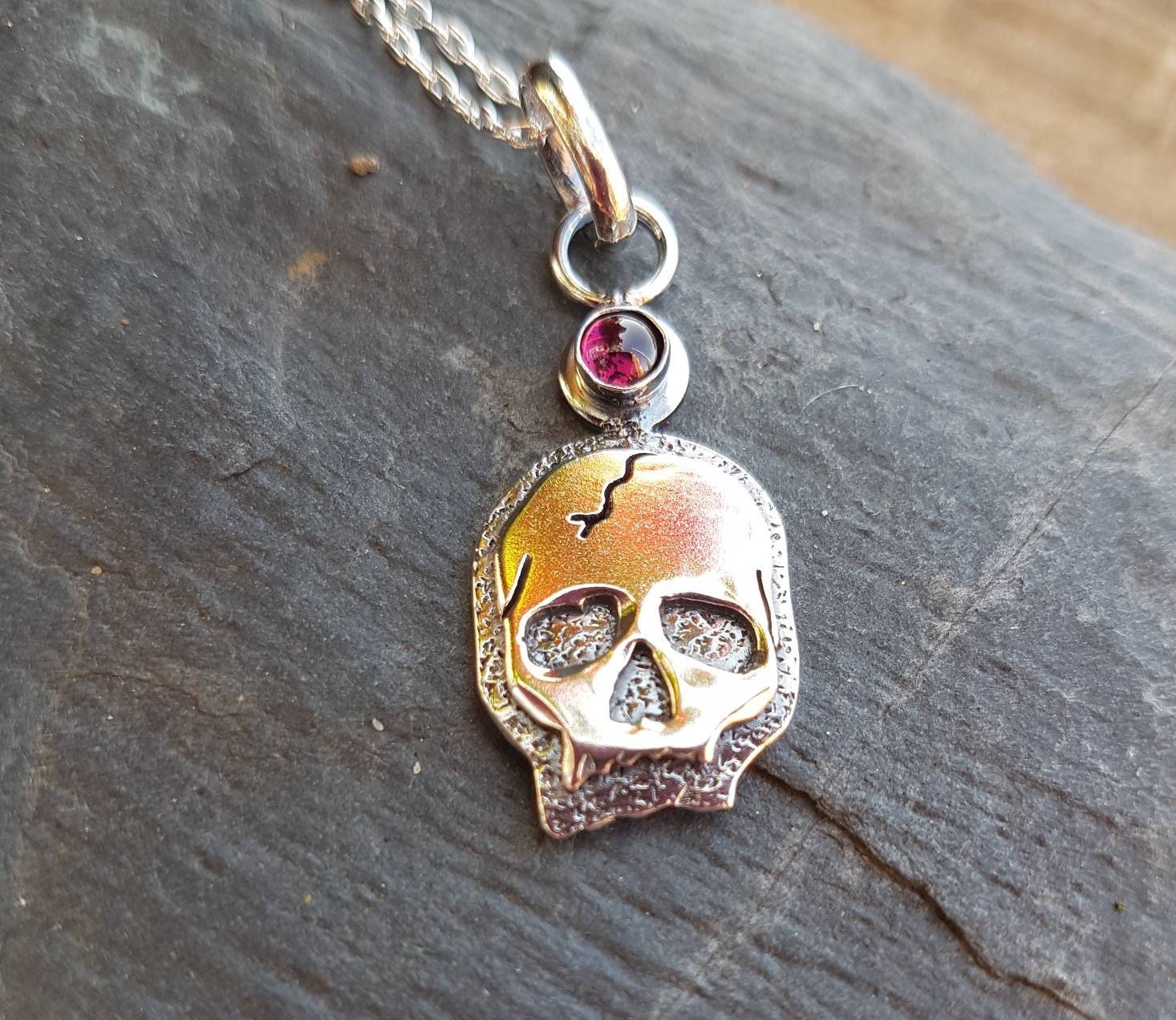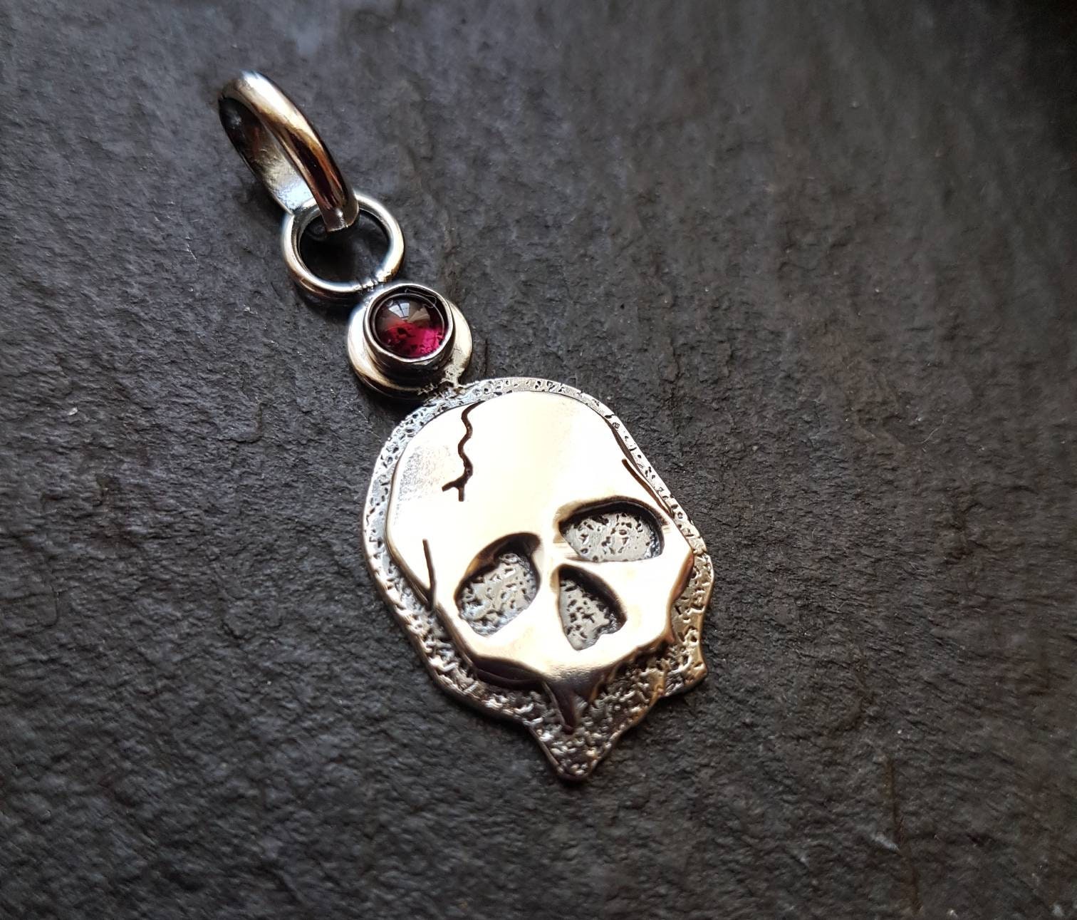Silver Skull Necklace with textured layers and garnet Sterling Skull pendant with silver chain