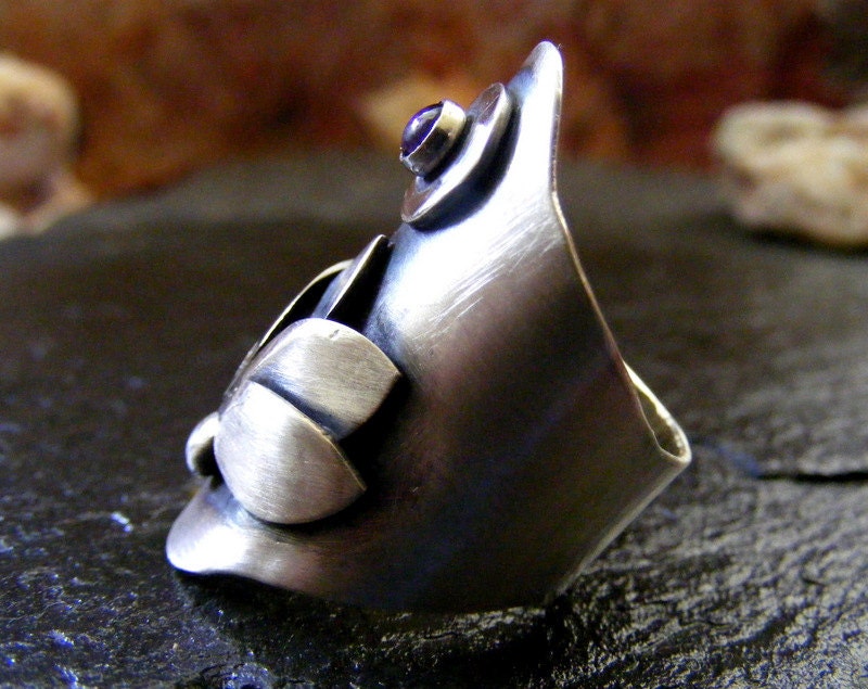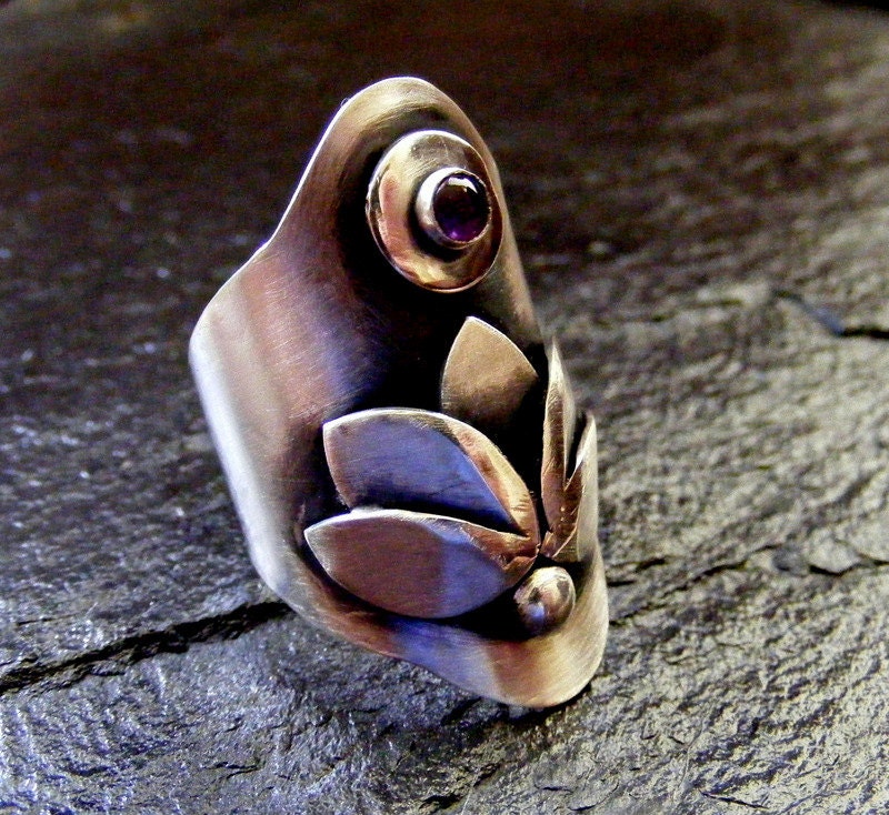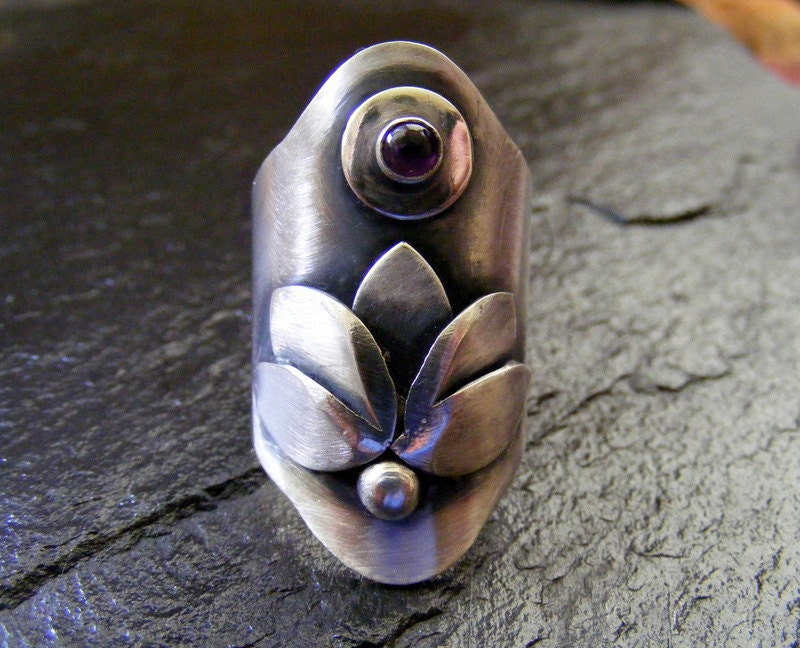 Silver Statement ring gemstone Lotus Flower ring with Amethyst ,Silver wide band gemstone Ring, Silver Cocktail Ring with precious stone