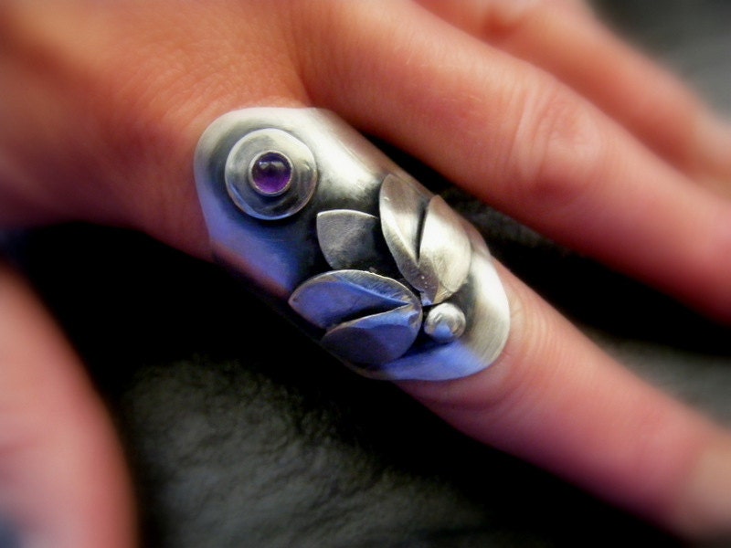 This is a sterling silver statement Lotus Flower ring with a beautiful amethyst gemstone and silver ball for accent and interest. The silver lotus flower has been hand cut leaf by leaf and is slightly raised for added dimension. A 4mm amethyst sits at the top of this ring to bring colour to the piece.