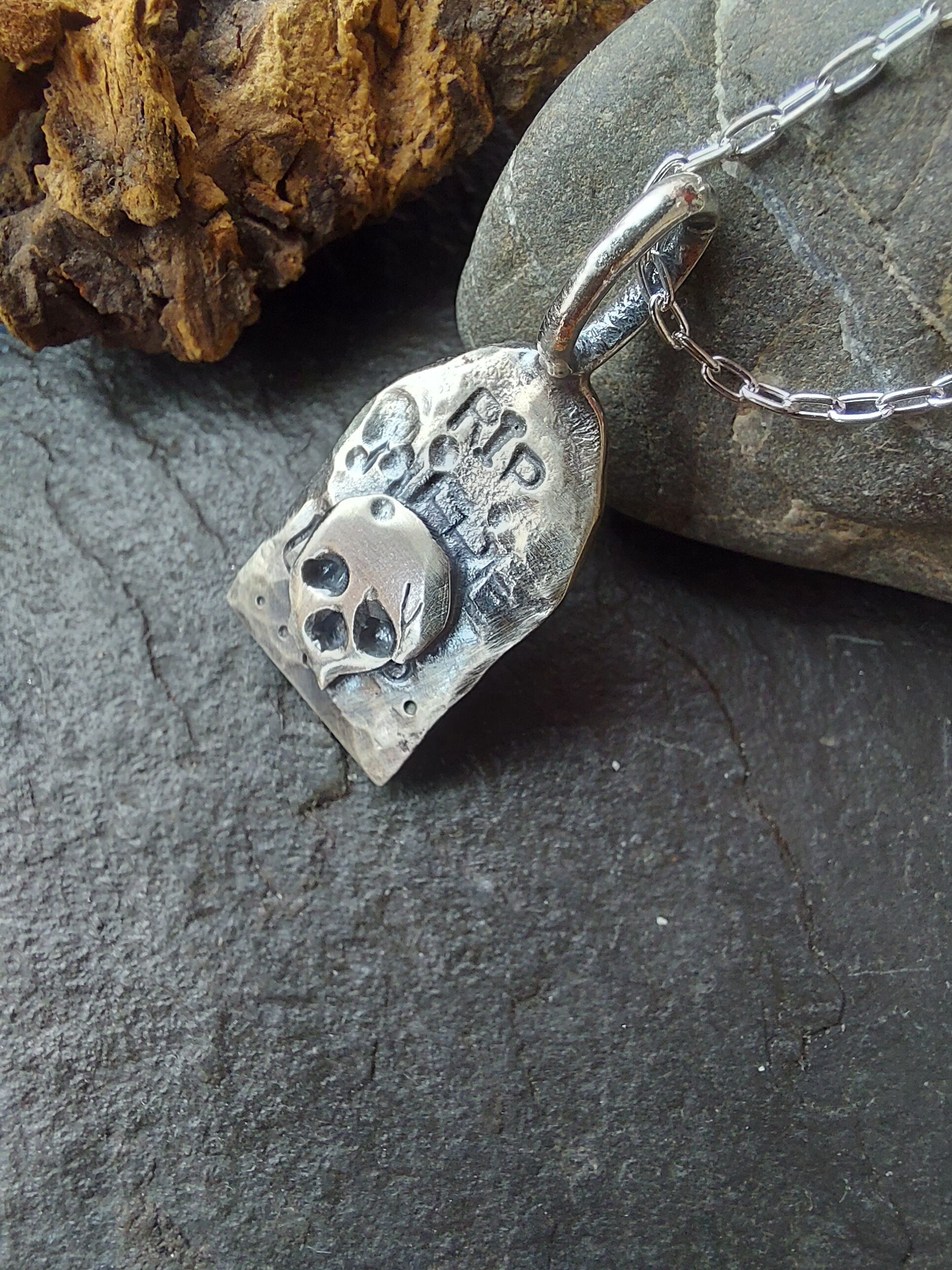 A sterling silver tombstone pendant with ' RIP' with stamped on the front , and a hand dawn skull Heavily textured and with a patina to give a rustic look .