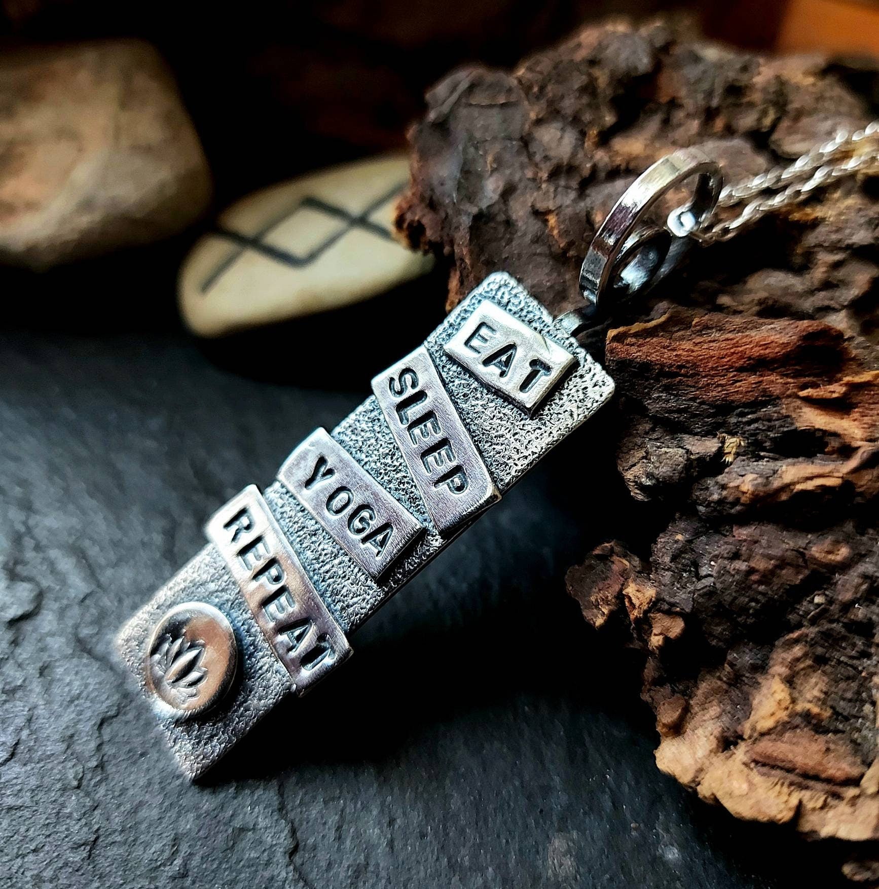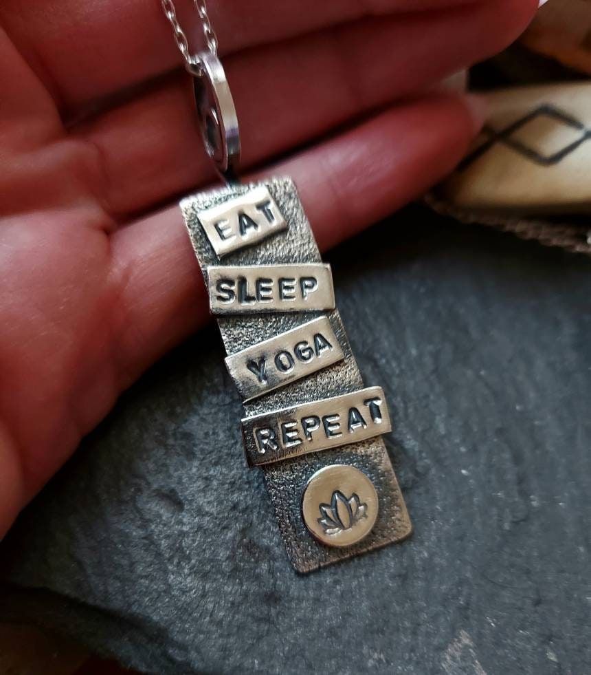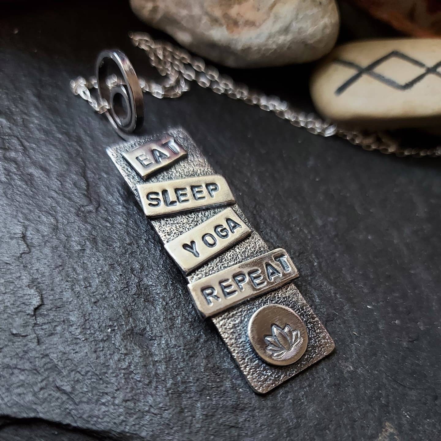 A solid silver tag , yoga quote necklace , with a curled bail and a little wellness mantra ... eat , sleep yoga, repeat