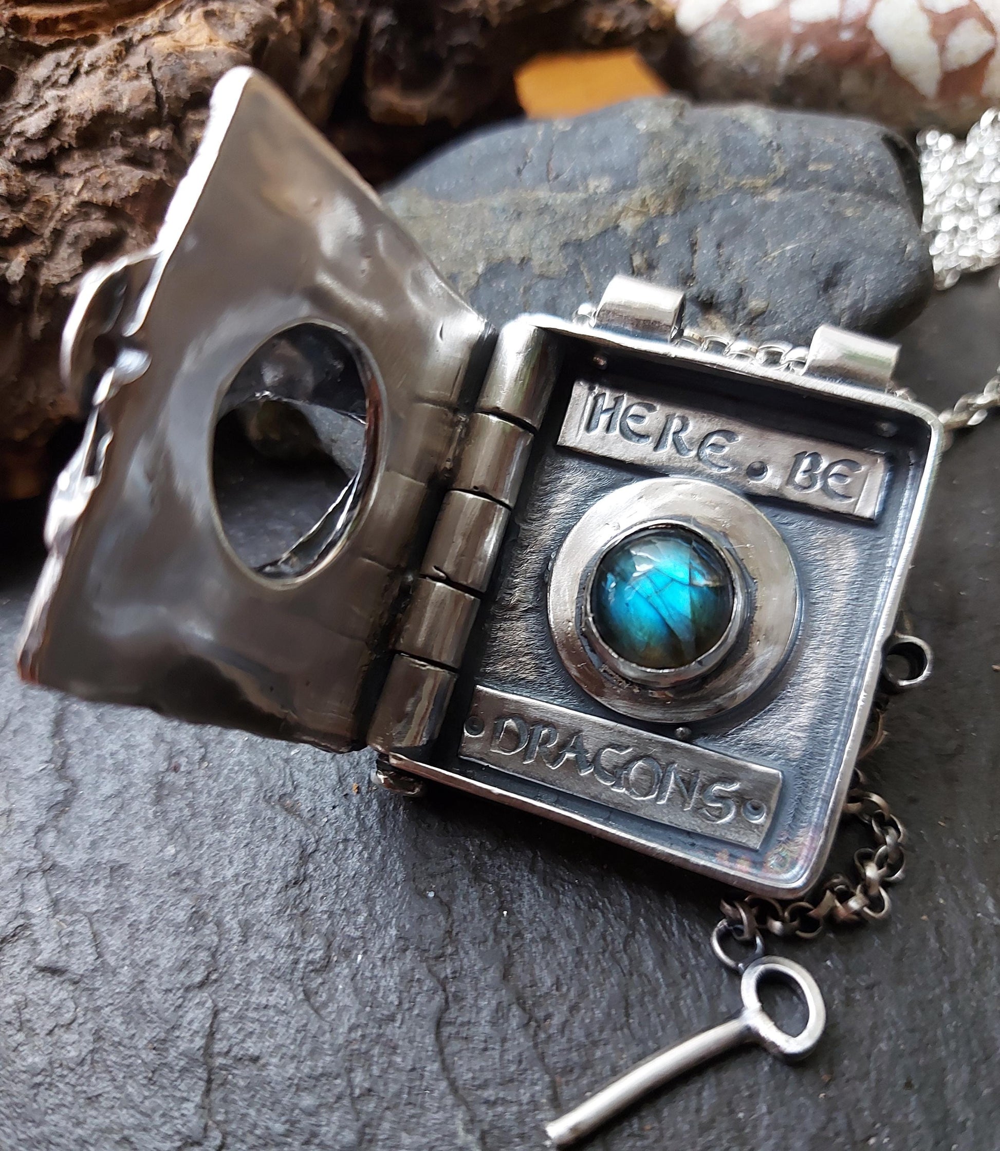 This eye locket have been hand cut from sheet silver and textured , formed, sawn and soldered to form the eye, with added details . Little silver balls , hinges, and a key hanging from an oxidised chain to hold the locket closed . The labradorite been encapsulated in a silver bezel on a silver base for a bit of extra colour and interesting detail
