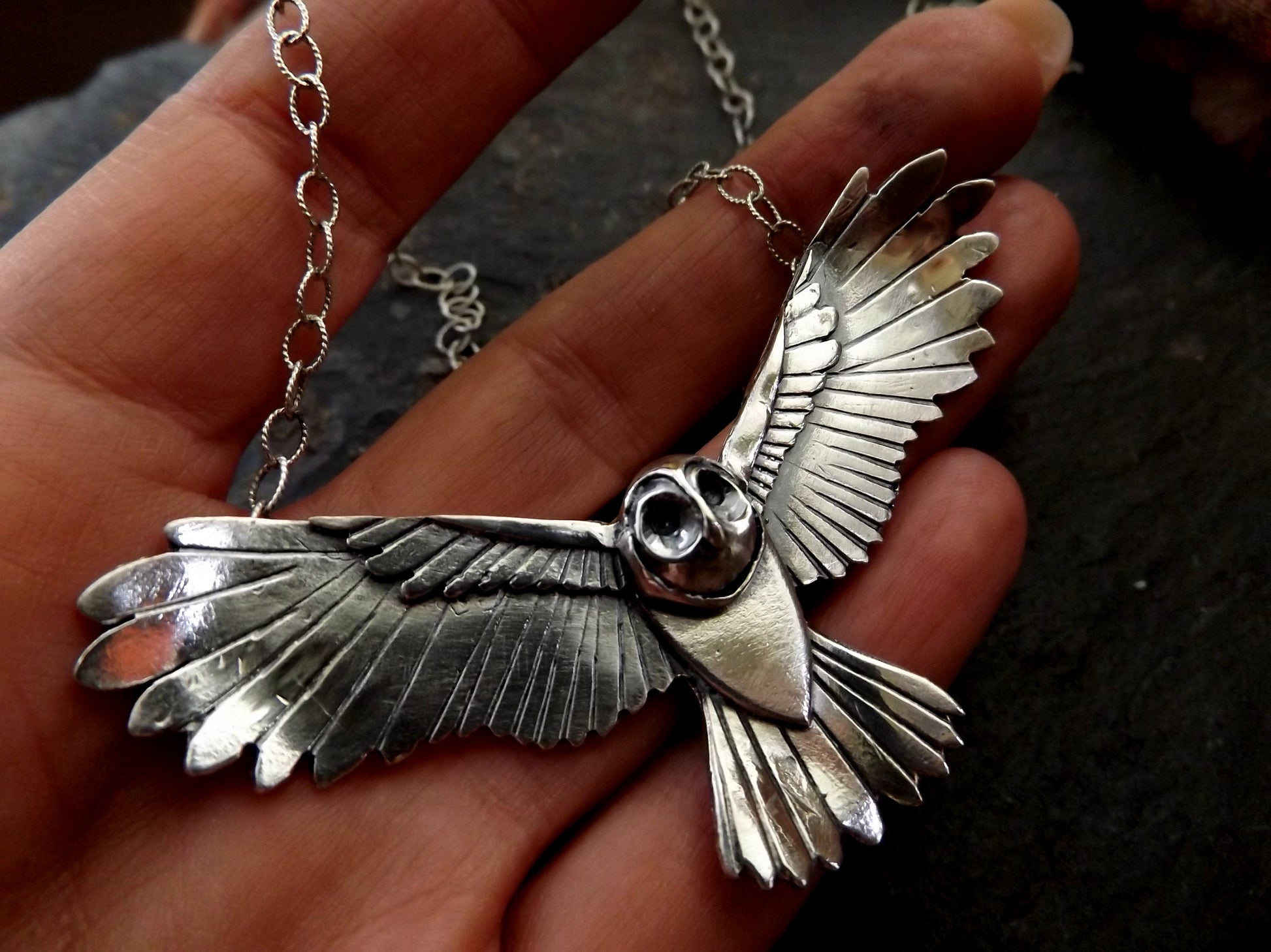 Sterling Silver Flying owl necklace , handmade silver statement owl