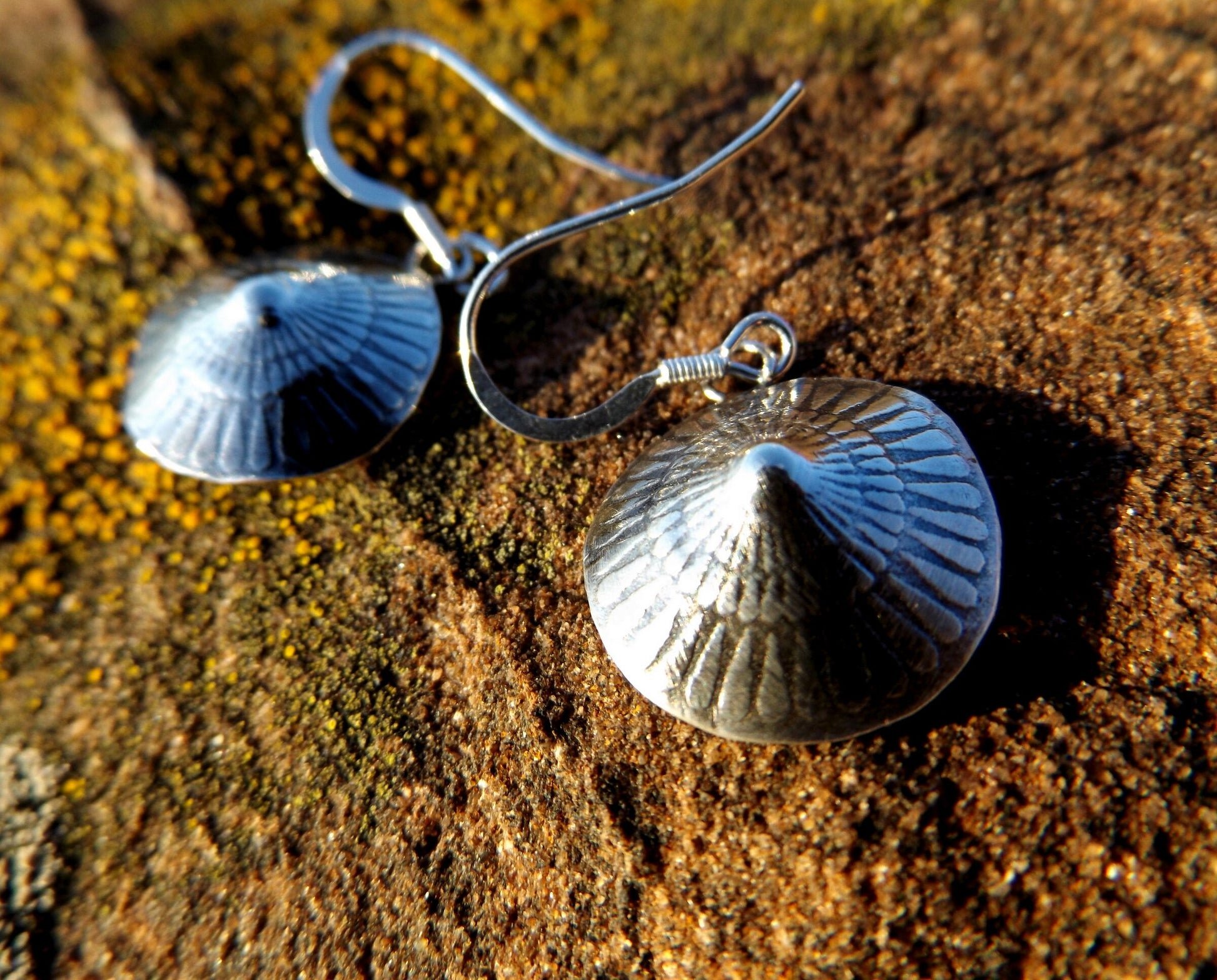 Sterling silver shell limpet style drop earrings, beach inspired textured oxidised dangle earrings